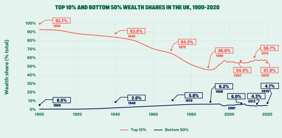 The reversal of wealth distribution trends in the UK after the 1990s is stark. By 2020, the wealthiest 10% saw their share inflate to 57.0%, a significant rise from the low of 46.0% in 1990. Conversely, the bottom 50% of the population saw their already small share of wealth diminish from 6.2% to 4.7%. These figures underline an escalating inequality, with wealth increasingly pooling at the top echelons of society, moving away from the egalitarian gains of the previous decades. It paints a picture where the socio-economic divide is widening, effectively deepening the chasm between the wealthy and the poor.